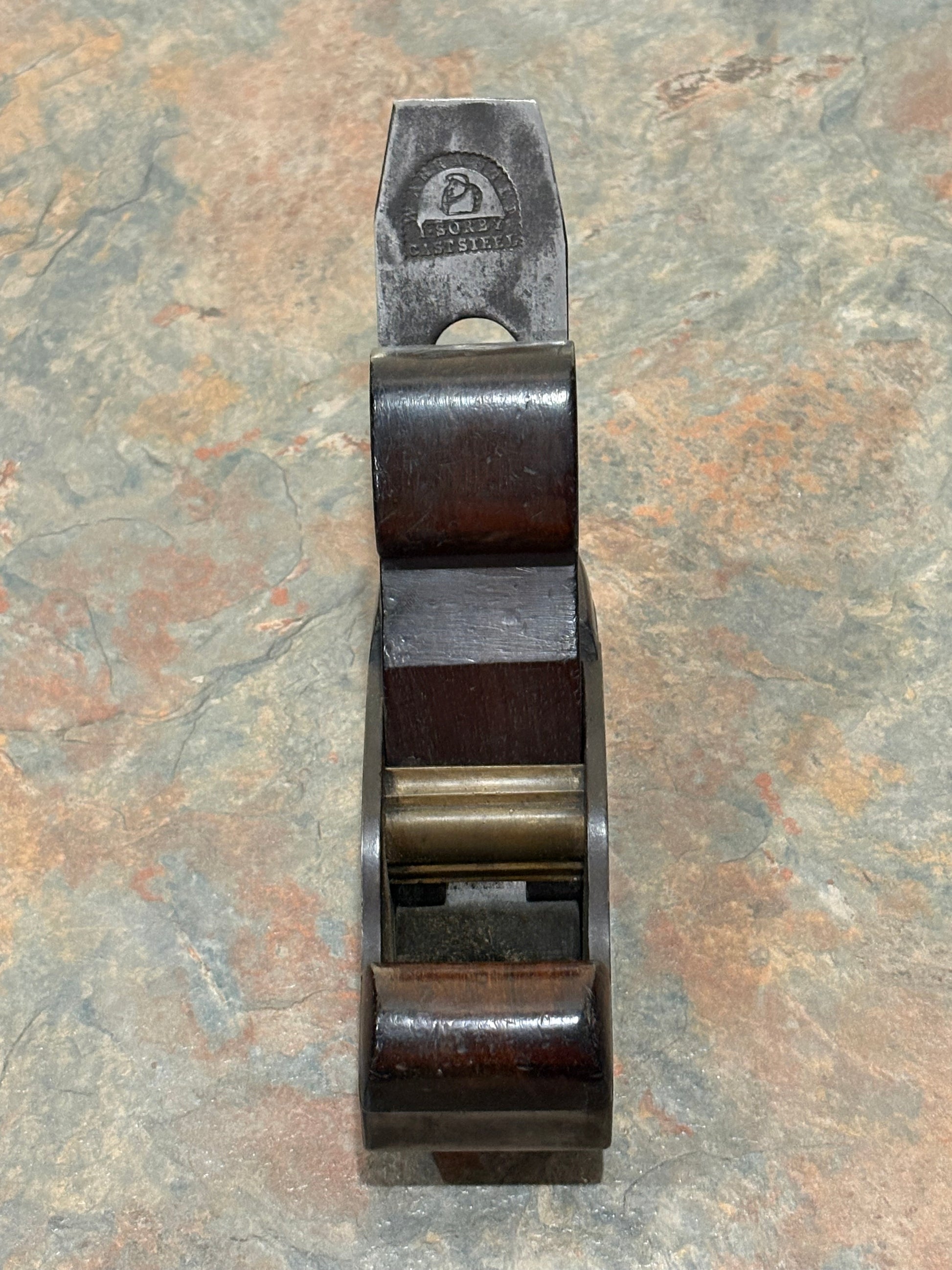 A REALLY NICE CONVEX CAST STEEL ROSEWOOD INFILL PLANE. MEASURES 5" LONG X 2" WIDE. CAST BODY IS IN EXCELLENT CONDITION WITH NO CRACKS OR BREAKS AND IS A FULL 1/8" THICK. BLADE IS STAMPED " WARRANTED, I. SORBY, CAST STEEL " AND CHIP BREAKER IS STAMPED " THOS. IBBOTSON & CO., WARRANTED STEEL ". ROSEWOOD INFILL & WEDGE ARE ALL ORIGINAL AND COLORS MATCH WITH NO CHIPS OR CRACKS TO THE WOOD. GUNMETAL BRIDGE TO HOLD WEDGE & BLADE. VERY WELL MADE AND LOOKS LIKE IT COULD HAVE BEEN MANUFACTURED BUT NO MAKERS MARKS ANYWHERE. A LOT OF HEFT TO THIS PIECE. A REALLY BEAUTIFUL PLANE.