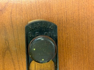 13 1/2” long, wooden sole inside metal frame that is marked HARRIS, SF., CA. on the toe and on the heel says “ PATENT APPLIED FOR “. Left cheek only is dovetailed. The only example we’ve seen.