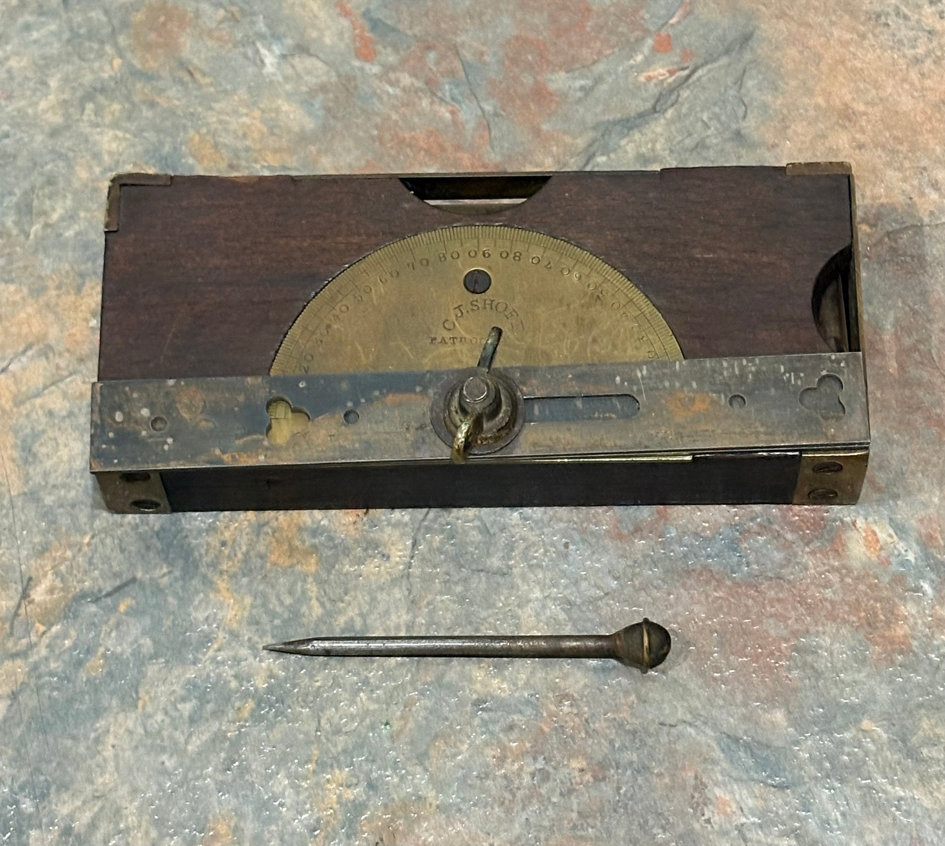 EXTREMLEY RARE C J SHOFF INCLINOMETER LEVEL. UBER RARE IN THE 6" SIZE, HAVE ONLY SEEN 3 IN 30 YEARS OF COLLECTING. USUALLY MISSING THE SCRIBE & OR THE BLADES. THIS ONE WAS MISSING THE BLADES WHICH WE HAD DUPLICATED NEW ONES BASED ON THE ORIGINAL BLADES FROM MY OTHER SHOFF LEVEL. IT WAS ALL LASER CUT TO THE EXACT DIMENSIONS INCLUDING THE CLOVER LEAF CUTOUT & THEN AGED. STILL HAS THE ORIGINAL SCRIBE. ALL VIALS FULL. STILL RETAINS SOME OF ITS ORIGINAL LACQUER FINISH.