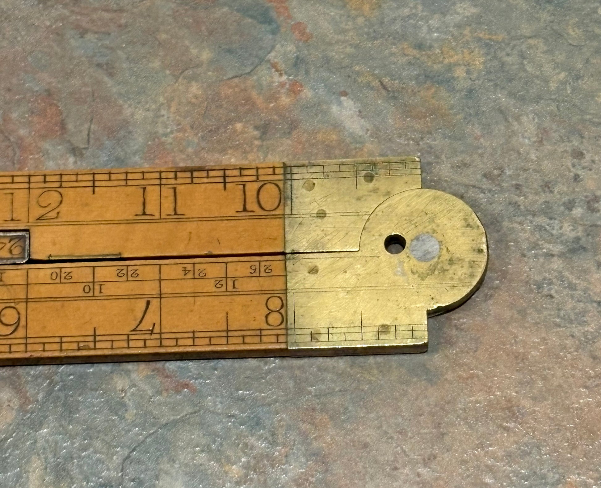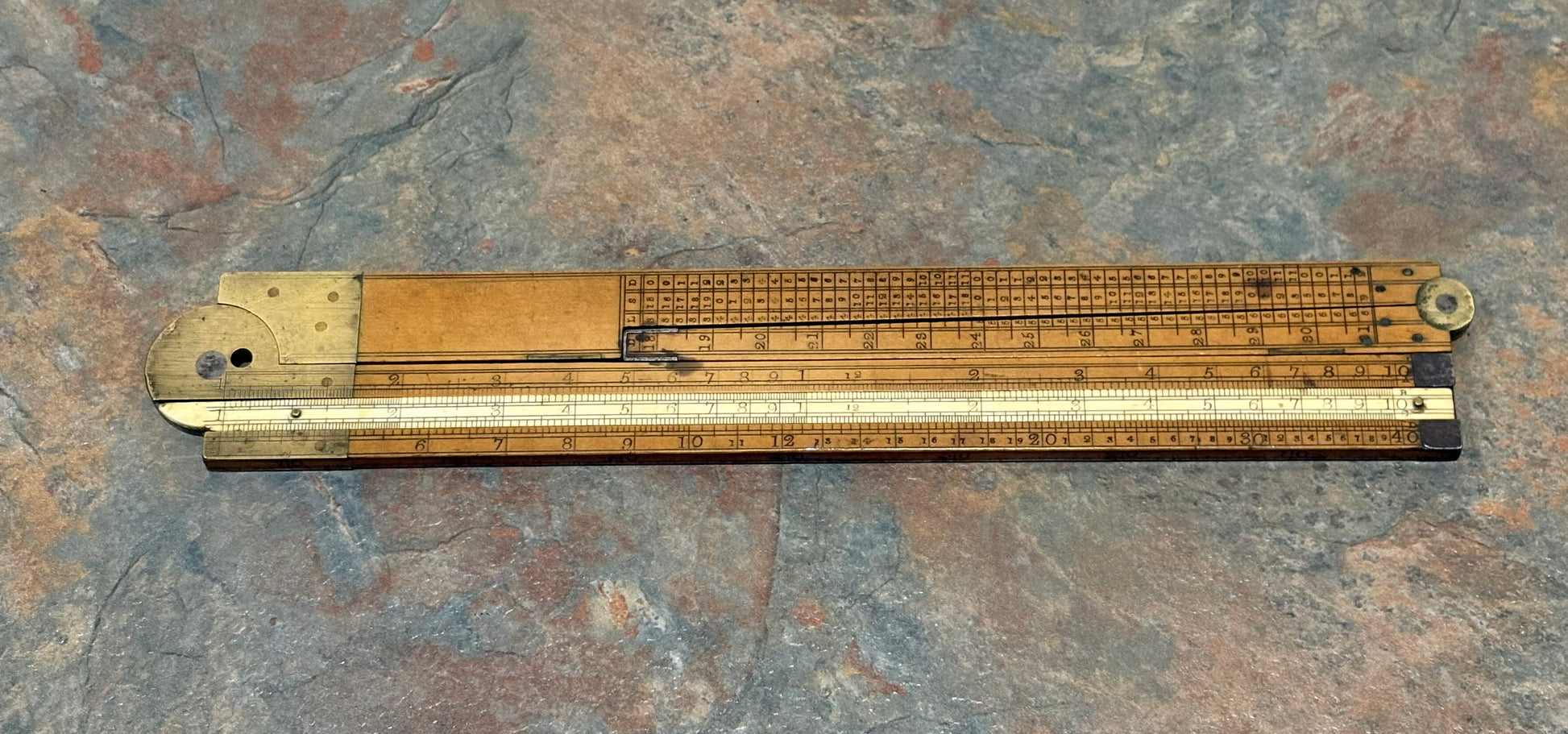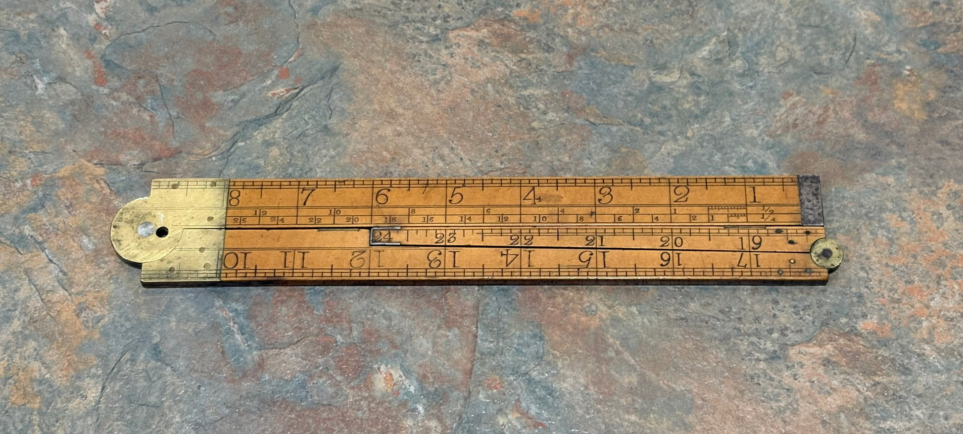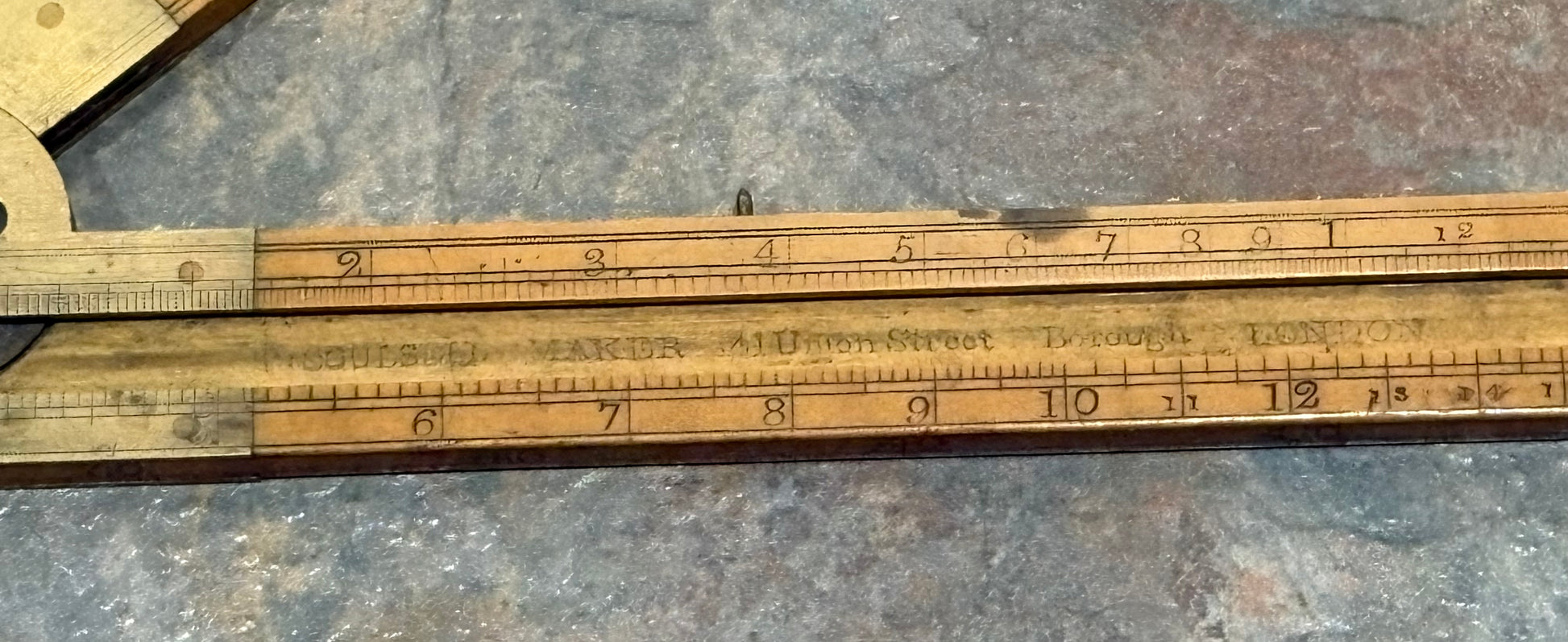 A MAGNIFICENT BOXWOOD & IVORY 2' 3 FOLD TIMBER RULE BY T. COULSELL, 1815-1836. LISTED IN " THE RULE BOOK, BY JANE AND MARK REES " ON PAGE 97. UNDER THE IVORY SLIDE IS IMPRINTED " T COULSELL MAKER 41 UNION STREET BOROUGH LONDON ". THERE IS ALSO SOME WRITING ON THE EDGES THAT I CANT MAKE OUT BUT BEEN THERE FOREVER. RULE FOLDS NICE AND STRAIGHT WITH NO WARPING OR BOWS. BOXWOOD HAS DEVELOPED A BEAUTIFUL RICH UNTOUCHED PATINA. NUMBERS ARE ALL VERY CLEAR WITH A MINIMAL OF USE. A FANTASTIC RULE IN PHENOMENAL SHAPE FOR BEING OVER 200 YEARS OLD. THERE IS A HOLE IN THE BRASS ARCH, NOT SURE IF ORIGINAL BUT NEEDED TO MENTION IT FOR HONEST DESCRIPTION.